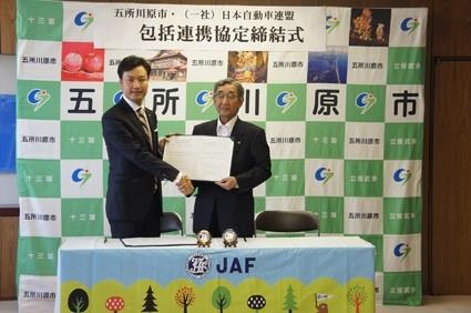 【五所川原】日本自動車連盟(JAF)青森支部(小野大介支部長)と青森県五所川原市(平山誠敏市長)は6月29日、東北初の「包括連携協定」を締結した。両者は観光振興に加え、交通安全や災害発生時の車両撤去など幅広い分野で相互に協力する。包括協定...