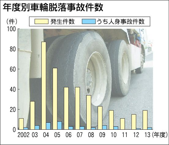 大型トラックなどの車輪脱落事故が再び増加の兆しを見せている。国土交通省によると、2013年度の脱落事故は19件(前年度比3割増)と11年度から2年連続で増えた。直近のピークだった04年度(87件)と比べると約5分の1だが、大型車のタイヤは...