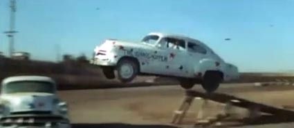元プロレーサーのトミー(ファビアン)が白い2ドアセダン「シボレー フリートライン・デラックス・2ドアセダン」をアクセル全開でジャンプ台へと向かわせ、同車は猛スピードで快晴の空へと飛び出した。青春映画「大暴走」のワンシーンだ。車を使ったサー...