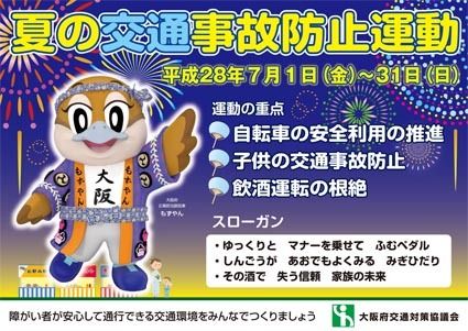 大阪府や大阪府警察本部など26機関で構成する大阪府交通対策協議会は、7月末まで「夏の交通事故防止運動」を展開している。ポスターの貼り出しやリーフレットの配布による啓発活動と警察による交通指導取り締まり強化などで交通事故防止を目指す。 府で...