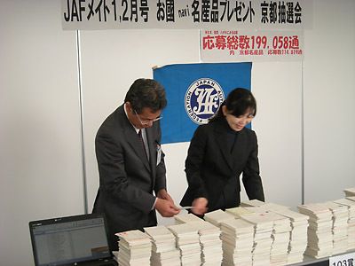 【京都】日本自動車連盟(JAF)京都支部(森川莫臣支部長)はこのほど、京都市南区上鳥羽の事務所で会員向け機関紙「JAF Mate」の1、2月号で募集した「お國navi名産品」の抽選会を開いた。当日は京都商工会議所企画総務部の細川万里子総務...