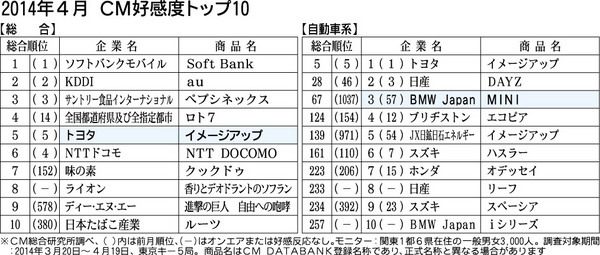 CM総合研究所(関根建男代表)がまとめた2014年4月度のCM好感度ランキングは、ソフトバンクモバイルが首位を保った。2位KDDI(au)、3位サントリー食品インターナショナル(ペプシネックス)のトップ3は変わらず。自動車関連では、トヨタ...