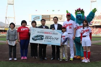 マツダは、広島市南区の野球場「マツダ Zoom Zoomスタジアム広島」の累計来場者が800万人に達したことを記念し、広島市西区の社会福祉法人おりづる(仲田仁理事長)に福祉車両「ビアンテ オートステップ車」1台を寄贈した。 贈呈式は9日、...