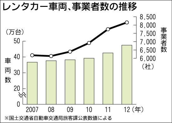 ◆代車への活用など拡大続く 国土交通省がまとめた統計によると、2012年3月31日時点の国内のレンタカー車両数は47万4501台に達し、過去最高を更新した。前年同期に比べ11・5%の増加で、増加率が2桁に達したのは1991年以来21年ぶり...