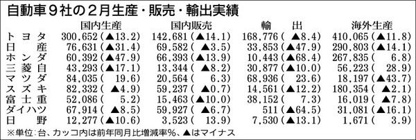 〈乗用車メーカーの生産・販売・輸出実績〉国内生産15・4%減、海外も6社が前年割れ