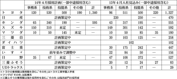 自動車メーカー各社の今春採用、大手はほぼ横ばい