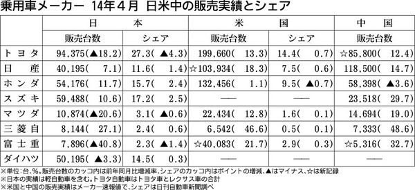 日本の乗用車メーカーによる2014年4月の日米中販売台数がまとまった。国内市場は消費税率引き上げによる需要減が影響し4社が前年同月を下回った。米国市場は6社全社が増加。日産自動車と富士重工業が4月新記録となったのを始め、ホンダを除く5社が...