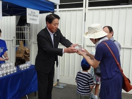 マツダ社長、被災者激励 オールスターの記念ボール手渡し