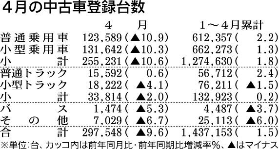 日本自動車販売協会連合会(自販連)が14日発表した4月の中古車登録台数は、前年同月比9・6%減の29万7548台となり5カ月ぶりに減少した。昨秋から増税前の駆け込み需要で新車販売の好調に伴い、中古車登録台数も4カ月連続で増加していたため、...