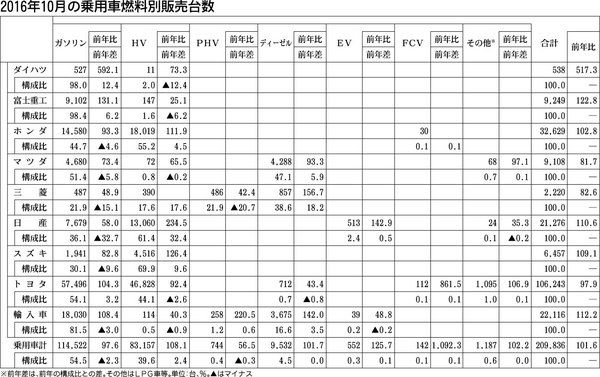 【2016年10月の乗用車燃料別販売台数】