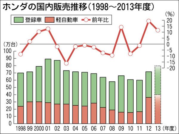 ホンダの峯川尚専務執行役員(日本営業本部長)は日刊自動車新聞のインタビューに応じ、2013年度の国内販売計画(軽自動車を含む)を80万台超に設定したことを明らかにした。12年度実績と比べると11・6%以上の増加となる。年度中に最低でも軽自...
