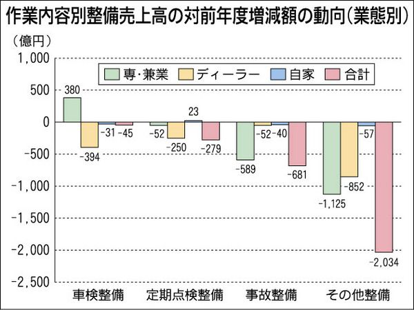 ■ 総売上高3年ぶり減少 デフレ長期化や震災影響 日本自動車整備振興会連合会(日整連、坪内恊致会長)が自動車整備白書2012年度版をまとめた。それによると総整備売上高は前年度比5・4%減の5兆2983億円と3年ぶりに減少するとともに、最近6...