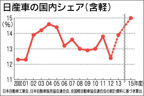日産自動車は、2013年度における国内販売(軽自動車を含む)のシェア目標を当初の15%から13・9%に引き下げる。15年度に再び15%を目指す計画で、目標達成を事実上先送りする。12年度は下期にエコカー補助金切れによる反動減があったほか、...