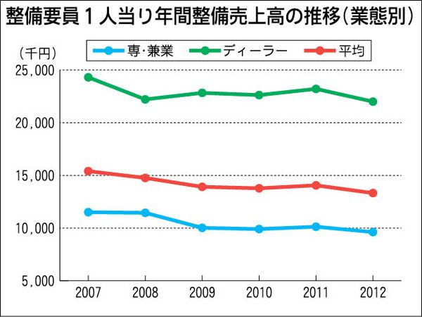 ■事業場数が頭打ちに 売上高減少で人件費抑制 リーマンショック後も増え続けてきた整備事業場数が頭打ちとなった。2012年度は9万1867事業場と前年度に比べ7事業場減少した。ディーラーは同0・3%減の1万5961と4年連続で減少している。専...