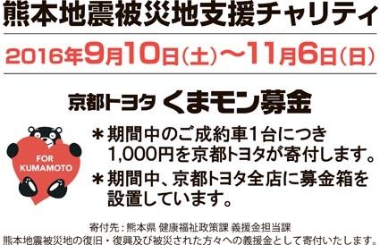 【京都】京都トヨタ(粂田昌宏社長)は9月から約2カ月間、熊本地震被災地支援チャリティー「京都トヨタ くまモン募金」を実施した。期間中に集まった浄財98万6105円を熊本県を通じて被災地復興支援として寄付した。 同社では9月10日~11月6...