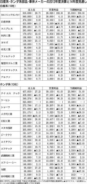 日産自動車系、ホンダ系部品メーカーの2014年度業績見通しは、売上高、営業利益ともに増加幅が前年度に比べ大幅に縮小する。円安が一服し為替換算に伴う増額を見込めないうえ、経済成長の鈍化が懸念される一部の新興国の通貨に対しては円高も想定される...