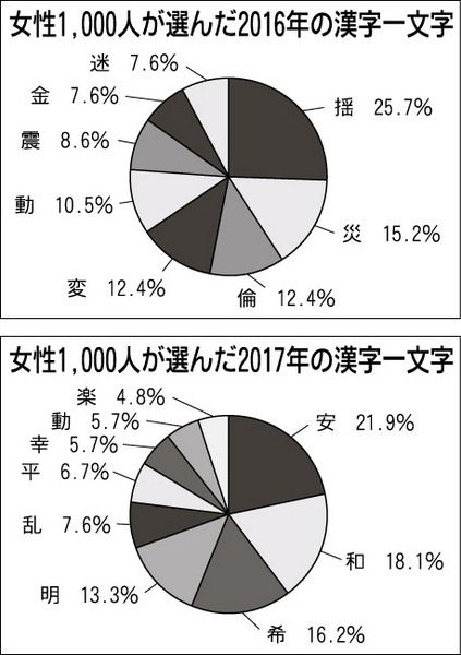 女性の消費行動マーケティング会社、ハー・ストーリィ(日野佳恵子社長)は女性が選んだ今年の漢字一文字を発表した。それによると今年を表す漢字一字の1位に「揺」、来年を願う漢字一文字の1位に「安」が選ばれた。その年を表す漢字一字は日本漢字能力検...