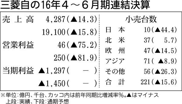三菱自動車が27日発表した2016年4~6月期(17年3月期第1四半期)の連結最終損益は、1297億円の赤字(前年同期は240億円の黒字)だった。燃費試験の不正問題に伴う軽自動車の生産・販売停止で国内販売が大幅に落ち込んだ。不正対象車両の...