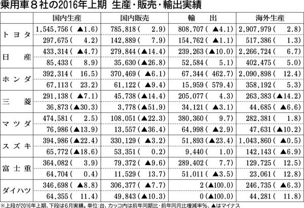 乗用車メーカー8社が28日発表した2016年上期(1~6月)の生産・販売・輸出実績によると、8社合計の国内生産台数は前年同期比3・1%減の424万2869台となり、上期として2年連続で前年同期を下回った。ホンダ、マツダ、富士重工業は増加し...