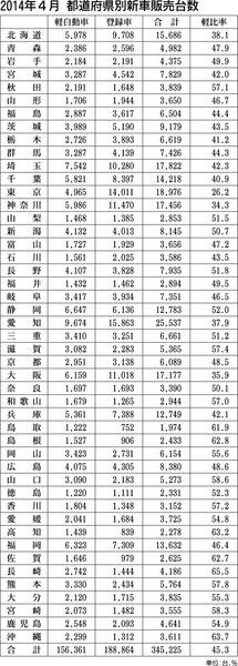 2014年4月の都道府県別新車販売台数がまとまった。消費増税の影響を受け、39都道府県で前年同月実績を下回った。また、登録車販売の落ち込みが大きかったのに対し、軽自動車販売が比較的堅調に推移したため新車販売全体に占める軽自動車の割合(軽比...