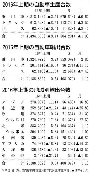 日本自動車工業会(自工会、西川廣人会長)が29日発表した2016年上期(1~6月)の国内生産台数は、前年同期比3・4%減の449万4583台となり、上期として2年連続で前年同期を下回った。軽自動車増税による需要減と燃費不正による生産停止の...
