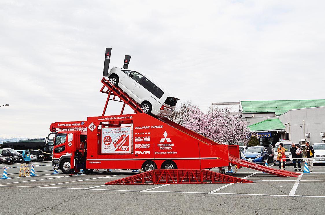 【寒河江】山形三菱(小野勉社長)はこのほど、寒河江市のチェリーランド寒河江で「三菱自動車4WD登坂キット体験イベント」を開催した=写真。参加者はプロドライバーが運転する「デリカD:5」と「エクリプスクロス」に乗車して、傾斜45度の登坂など...