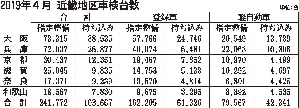 近畿地区の2019年4月の継続検査(車検)台数(軽自動車を含む)は、16・9%増の34万5439台だった。5カ月ぶりの2桁増を記録し、前年超えを7カ月連続とした。19年度の車検台数は好調な滑り出しを切った。 登録車、軽ともに大幅増を示した...