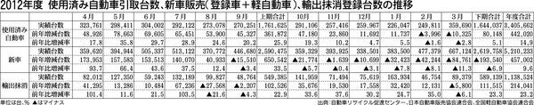 自動車リサイクル促進センター(JARC、郡嶌孝理事長)がまとめた2012年度の使用済み自動車引取台数は、前年比14・9%増の340万5662台で2年ぶりのプラスとなった。12年度実績を月別で見ると、新車販売台数と輸出抹消登録台数の増減幅と...