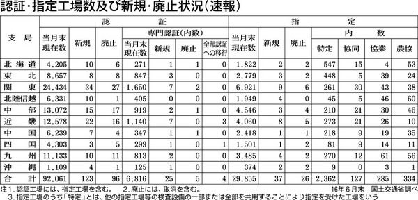 国土交通省は2016年6月末時点の認証・指定工場数および新規・廃止状況をまとめた。認証工場数は前月比27工場増の9万2061工場と4カ月ぶりに増加した。指定工場数も同11工場増えて、2万9855工場。専門認証工場数は6816工場で前月比1...