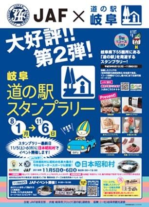 【岐阜】日本自動車連盟(JAF)岐阜支部(甲谷弘支部長)は1日、県内の道の駅を巡ったユーザーに地元の名産品などを贈呈する企画「道の駅スタンプラリー」を開始した。初開催だった昨年に続き2回目の開催。今回は最終日に簡易モータースポーツ「オート...