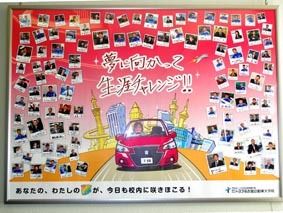 ○…「夢に向かって生涯チャレンジ」と記されたメッセージと、ピンクのクラウンが中央に描かれ、周りにたくさんの顔写真が散りばめられたボードが、トヨタ名古屋自動車大学校内の数カ所に掲示されている。顔写真の主は同校の教職員で「職員が輝きを増すこと...