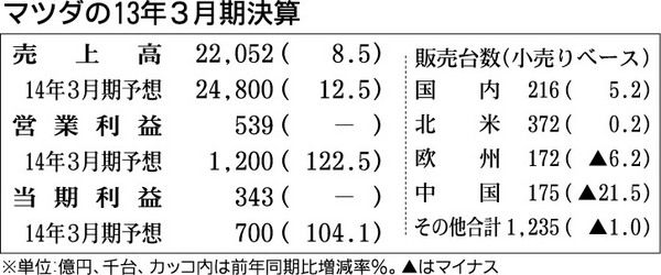 マツダが26日発表した2013年3月期の連結決算は、純利益が343億円(前年は1077億円の赤字)となり5年ぶりの最終黒字化を果たした。営業利益と経常利益も2年ぶりの黒字に転換した。売上高は前年比8・5%増の2兆2052億円で、2年ぶりの...