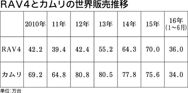 トヨタ自動車の世界販売で、中型SUV「RAV4」の存在感が高まっている。今年1~6月の実績は36万台で、トヨタを代表する中型セダン「カムリ」の34万台を初めて上回り、同社の量販車種として「カローラ」に次ぐ2番手に躍り出た。背景にはガソリン...