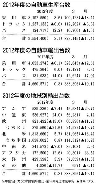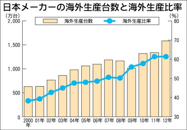 自工会が30日に発表した2012年(暦年)における日本メーカーの海外生産台数は、前年比18・2%増の1582万5398台となり、3年連続で増加した。内外での生産台数全体に占める海外生産の割合は61・415%。リーマンショックを受けた08年...