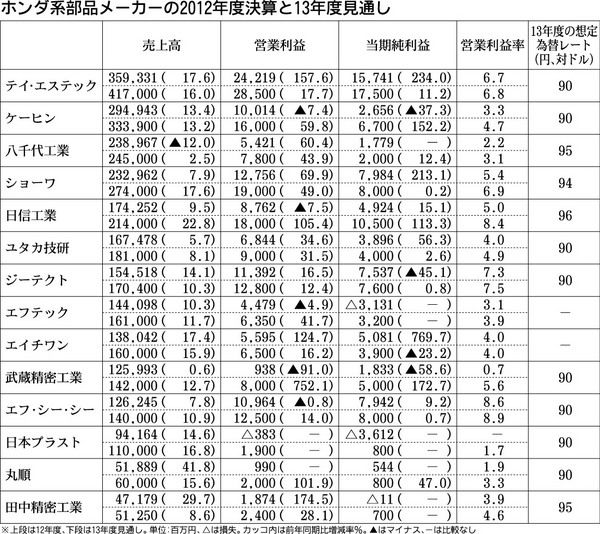 ホンダ系部品メーカー14社がまとめた2013年度の業績見通しは、販売量の増加に加え、為替の円高修正が追い風になり、全社が増収・営業増益を予想している。売上高は11社が2桁の増加を見込み、営業利益は軒並みの大幅な増加になる見通しだ。12年度...
