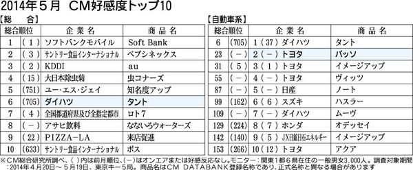CM総合研究所(関根建男代表)がまとめた2014年5月度のCM好感度ランキングの自動車関連トップはダイハツの「タント」で、前月の37位からジャンプアップした。総合では6位。2位はトヨタ「パッソ」が入った。総合ではソフトバンクモバイルの「ソ...