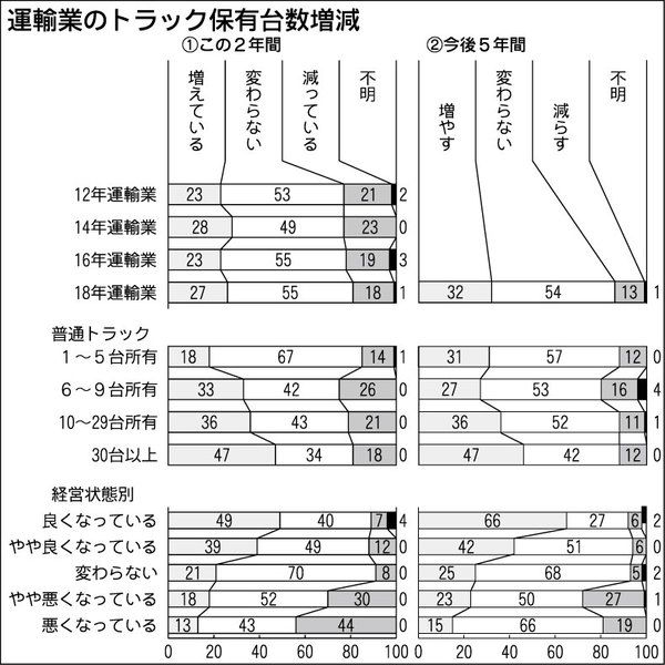 調査は全国の普通トラック保有事業所と荷主を対象に、18年8月下旬~10月上旬に実施。8日に内容をまとめた報告書を公表した。 運輸業・自家用の経営状況は「好転」が「悪化」を上回り、トラックの稼働率が上昇している。一方、荷主も経営状況が「良...