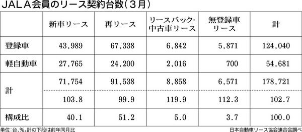 日本自動車リース協会連合会(JALA、佐藤誠会長)がまとめた3月の会員リース契約台数は、前年同月比2・7%増の17万8721台と2カ月連続で増加した。新車販売が好調な軽自動車がリース契約でも牽引する格好となった。新車販売に占めるリース車比...