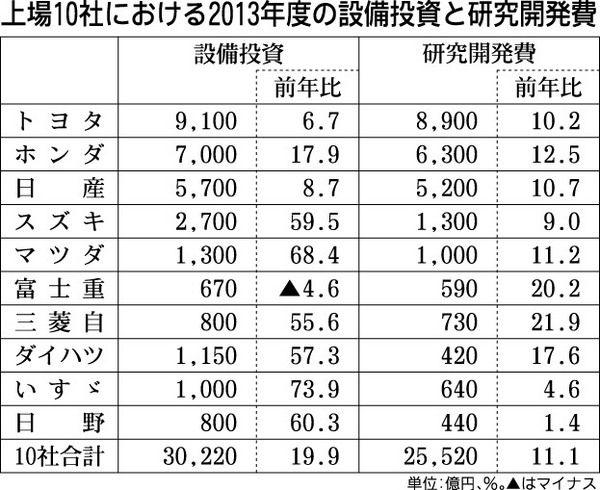 ◆研究開発費 全社増 高い利益水準を確保した自動車メーカー各社は2013年度、ほぼ全社が設備投資を積み増す計画を打ち出している。上場10社の設備投資額を単純に加算すると合計額は3兆円を上回り、12年度実績から約2割増と大きく上振れする格好だ...