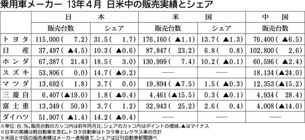 日本メーカーによる4月の日本・米国・中国おける販売実績がまとまった。登録車販売が8カ月ぶりに増加に転じた日本では、トヨタ自動車がエコカーを中心に販売台数を伸ばし、5カ月ぶりにシェア30%を確保した。米国では日産自動車が「アルティマ」の好調...
