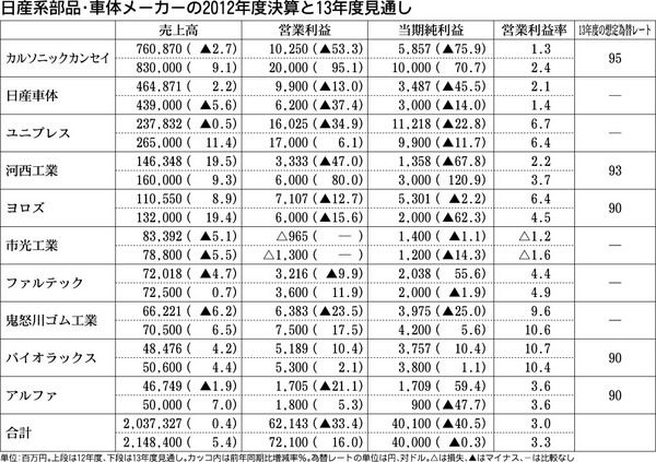 日産系部品・車体メーカー10社の2014年3月期業績見通しは、売上高が10社合計で2兆1484億円と前期比5・4%増、営業利益は721億円で同16・0%増の増収増益となる見通しだ。13年3月期は日中関係悪化による中国での日本車不買、北米で...