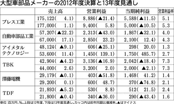大型車向け部品6社、13年度業績見通し