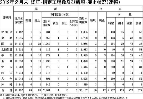 国土交通省は2019年2月末時点の認証・指定工場数および新規・廃止状況をまとめた。認証工場は9万1797工場で前月比14件減となり、指定工場は前月比18件増の3万107工場だった。専門認証工場数は2件増の7264工場だった。 前年同月比で...