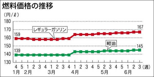 Q このところ、ガソリン価格が高いね? A 資源エネルギー庁によるレギュラーガソリンの平均価格は16日時点で1リットル167円。小刻みではありますが、8週連続で値上がりしています。「ウクライナやイラク情勢により原油相場が上がったため」との...