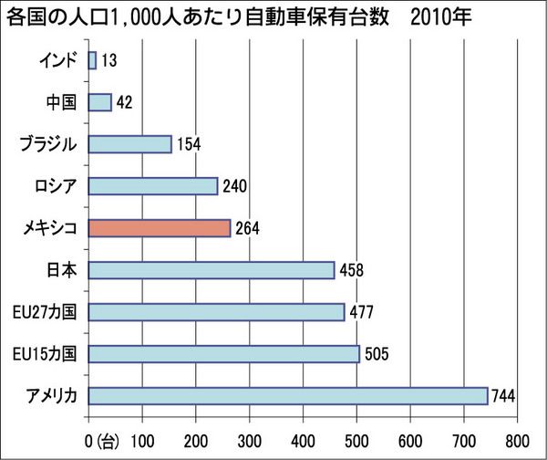 メキシコ市場はまだ発展途上にあると言えよう。2010年時点での小型車の人口千人あたり保有台数は264台で、これはアメリカのそれを65%下回り、先進国の大半よりも低い。しかしBRICs4カ国に比べれば市場は発展している。 小型車の年間需要は...