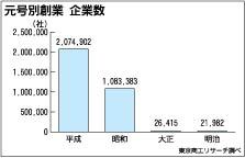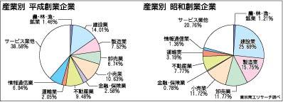 平成も残すところあと4日。東京商工リサーチが平成時代に創業された企業(平成企業)数を調べたところ、昭和時代に創業された企業(昭和企業)の約2倍にのぼることが分かった。産業別では、平成企業の約4割をサービス業が占め、製造業などの重厚長大企業...