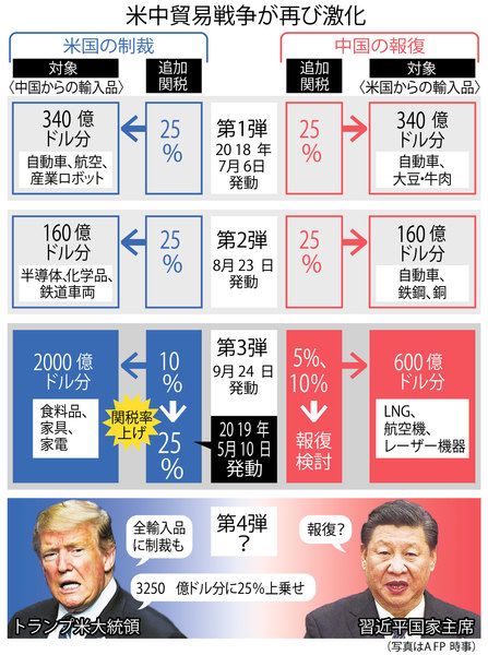 米国と中国の閣僚級貿易交渉で隔たりが埋まらなかったのを受け、米トランプ政権は米東部時間10日午前0時1分(日本時間10日午後1時1分)、年間2千億ドル(約22兆円)分の中国からの輸入製品に対する追加関税を10%から25%へ引き上げた。中国...