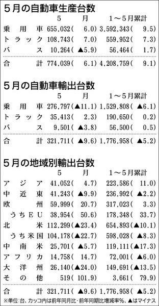 日本自動車工業会は30日、5月度の国内生産実績が前年同月比6・1%増の77万4039台となり9カ月連続のプラスになったと発表した。5月の国内販売台数や輸出実績がマイナスとなる中、国内生産だけが増えた形となっているが、消費増税に伴う駆け込み...