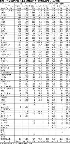 【16年8月の車名県別輸入車新規登録台数(乗用車、貨物、バス合計)】