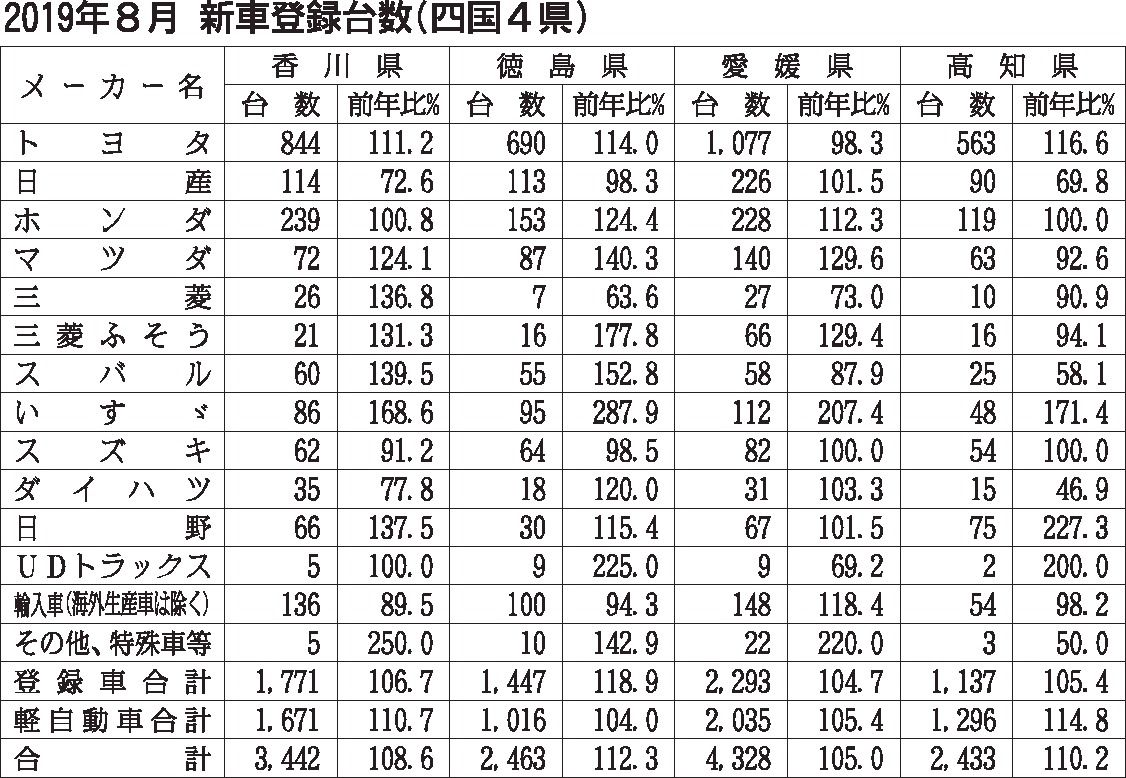 四国地区8月の新車販売台数は登録車、軽自動車とも増加し、合計で前年同月比8・3%増の1万2666台と、5カ月連続で伸長した。伸び率では消費増税前の駆け込み需要とみられる普通・小型貨物車の増加が目立った。 登録車は同8・2%増の6648台で...
